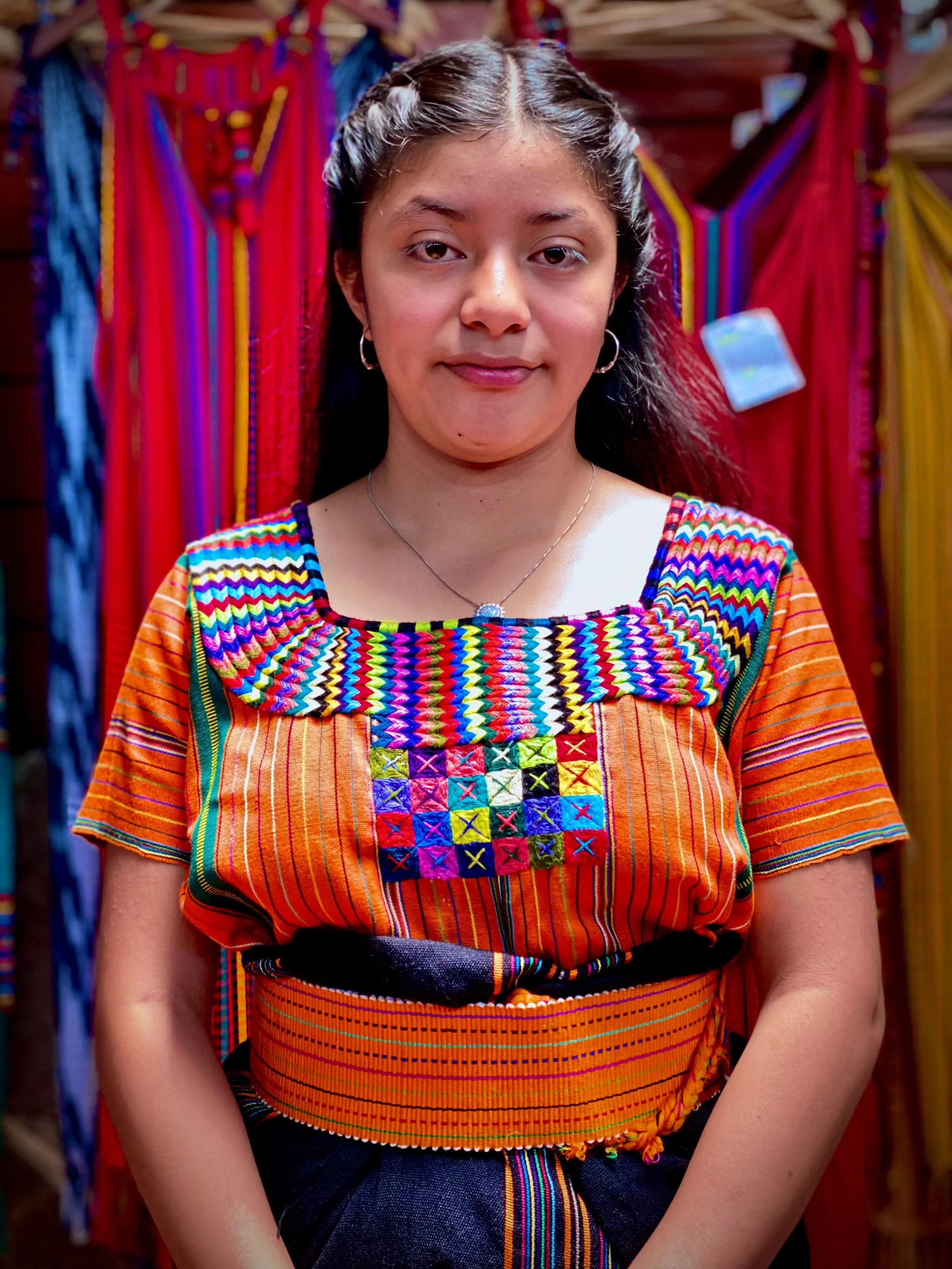 Theresa is a young weaver from San Juan la Laguna, Guatemala, deeply connected to the art of weaving through her family. She works alongside her mother, crafting beautiful textiles such as shawls, jackets, and scarves. Theresa's role involves preparing the threads and assisting with dyeing, weaving, and finishing the garments. She finds joy in working closely with her mother, combining colors and cotton to create unique pieces.